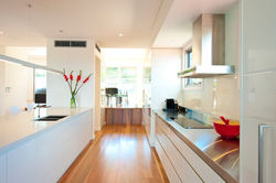 This project was a new build in Curl Curl on the Northern Beaches of Sydney. The kitchen is an expansive space that allowed for many inclusions such as a walk in pantry, pull out pantry, numerous drawers for easy and ergonomic storage, integrated refrigerators and dishwasher, two appliance cabinets and a chefs dream with stainless steel benchtops on stove wall benchtop run. The island bar bench is Caesarstone in Snow with all cabinetry polyurethane satin finish in Dulux colour Antique White USA at Quarter Strength. A feature fireplace on the dining room side of the island allowed for a tiled feature wall surround in natural Bluestone tiles.